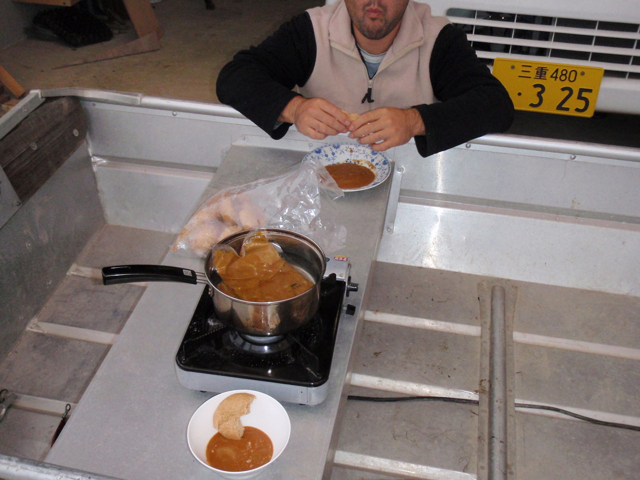 アルミボートの上で食べる