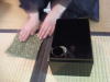 31 右手その横の古帛紗をとり、そのまま箱の向こうにおいて広げる。
