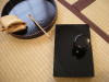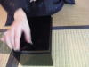 26 右手で右膝横の古帛紗をとって、左のひらの上にのせ、箱と蓋の間におく。
