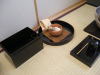 43 再び客付き斜めにまわって箱をとり、瓶掛正面に持ちまわって、勝手付き、盆の手前(初めに建水のあった場所)に置く。