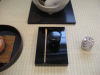 38 瓶掛正面に戻り両手で箱を取り、また客付き斜めに持ってまわり、右向こう、左手前とまわして、蓋の右に出す。