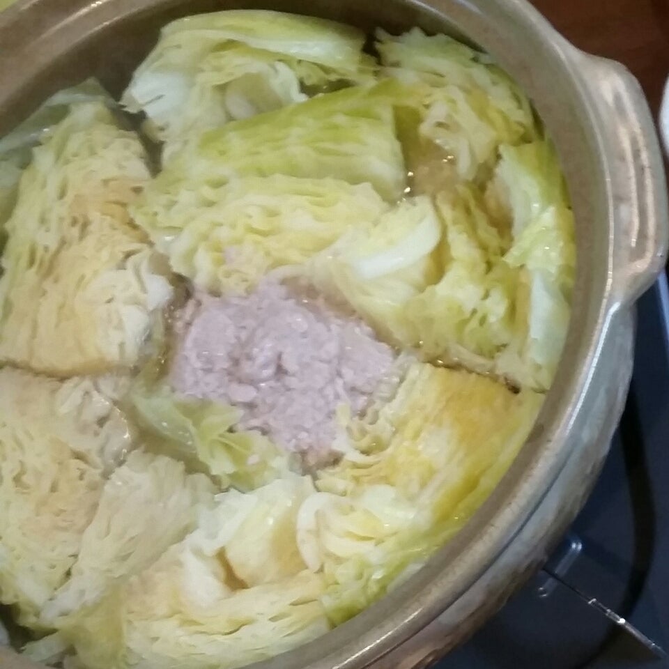 キャベツをざく切りにして鍋に詰める。