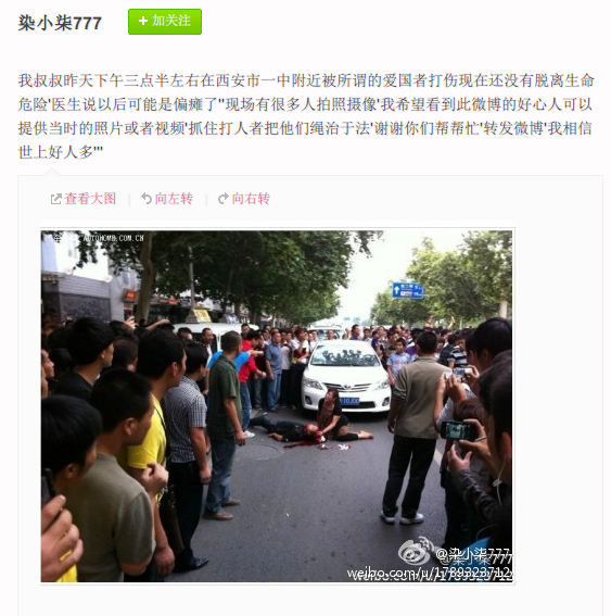 【中国のツイート】「叔父が昨日午後3時半ごろ、西安市第一中学付近で自称『愛国者』に殴られ、