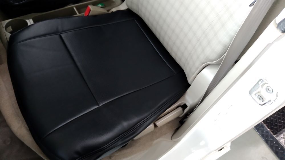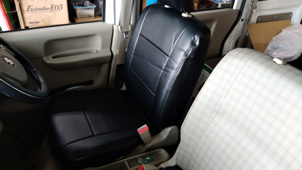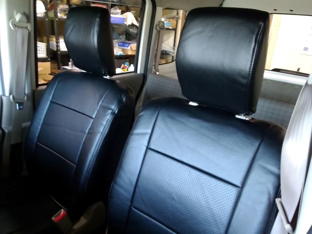 シートカバー世間様はお盆休みですが 先週入庫しましたエブリィのフロントシートに破れが有ったもんで レザー調のシートカバーを装着してあら隠しでございます 暑いのでノビノビですんなりと被せれます 多少のシワは馴染んでいけばぁー スパルタンな仕上げに満足 でも黒なんで夏は暑いです