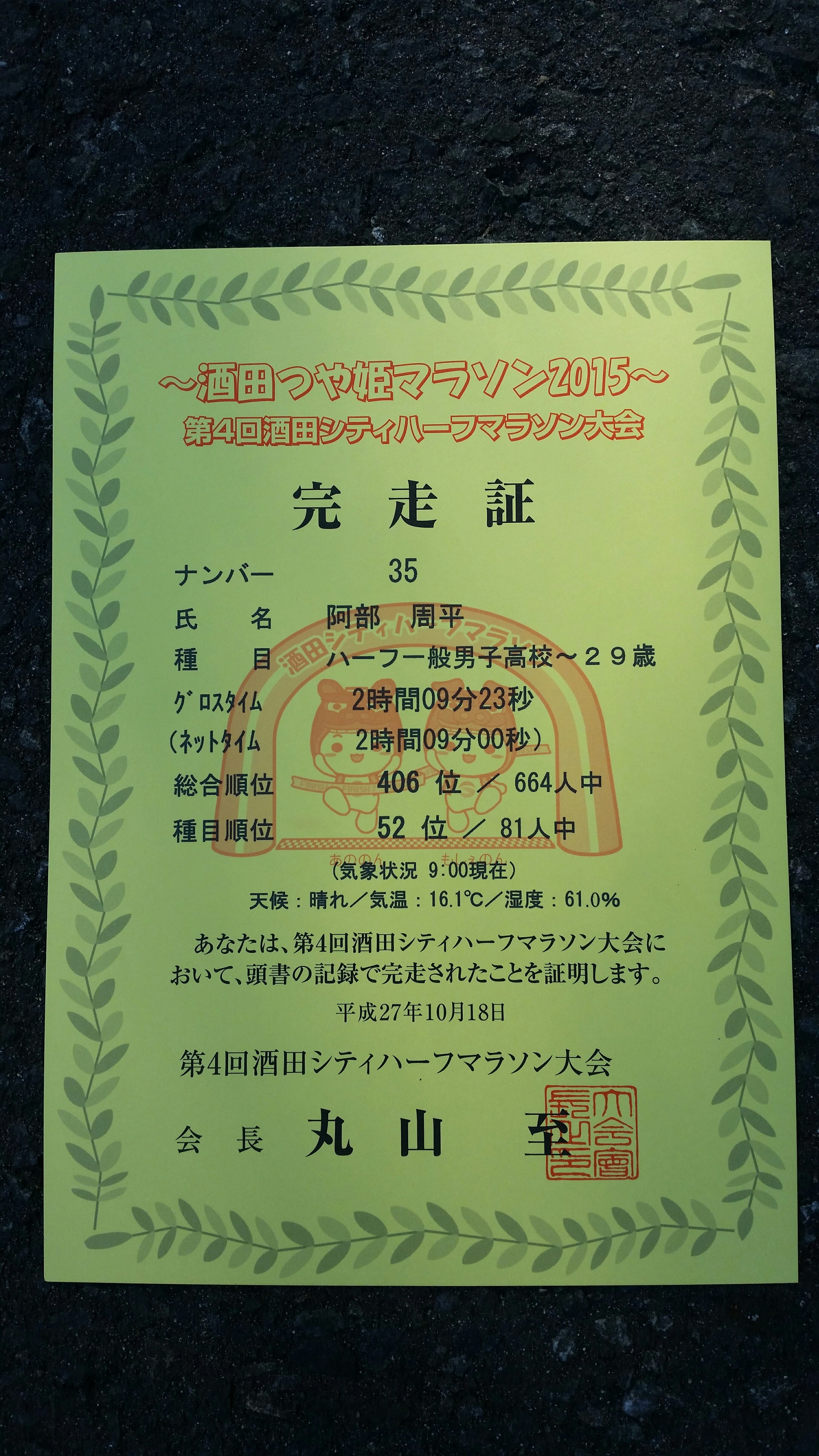 ハーフマラソンは2時間09分23秒、目標タイムに30分も届いてない、惨敗でした。