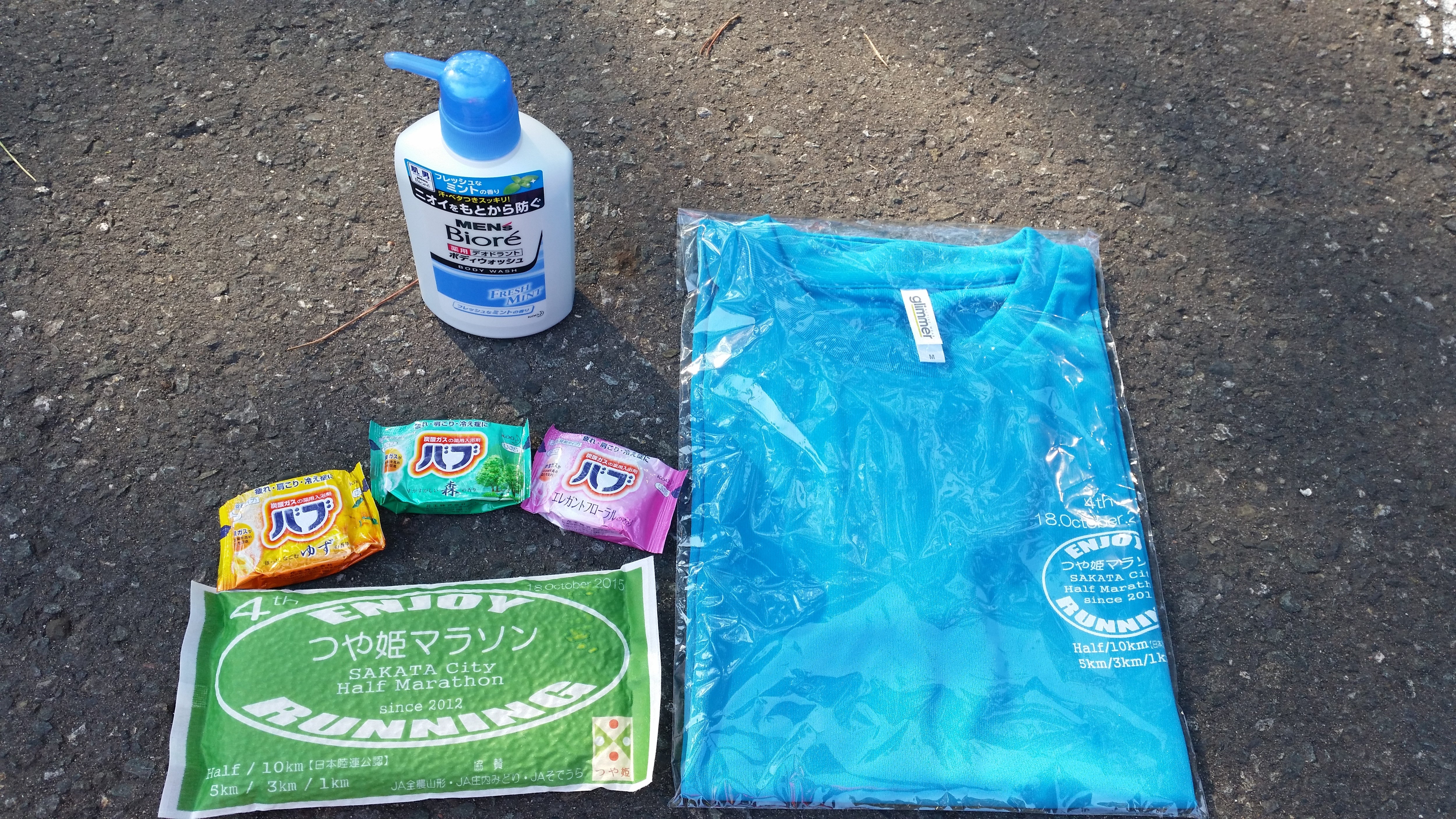 さて、参加賞はTシャツとメンズビオレとバブ、つや姫です。