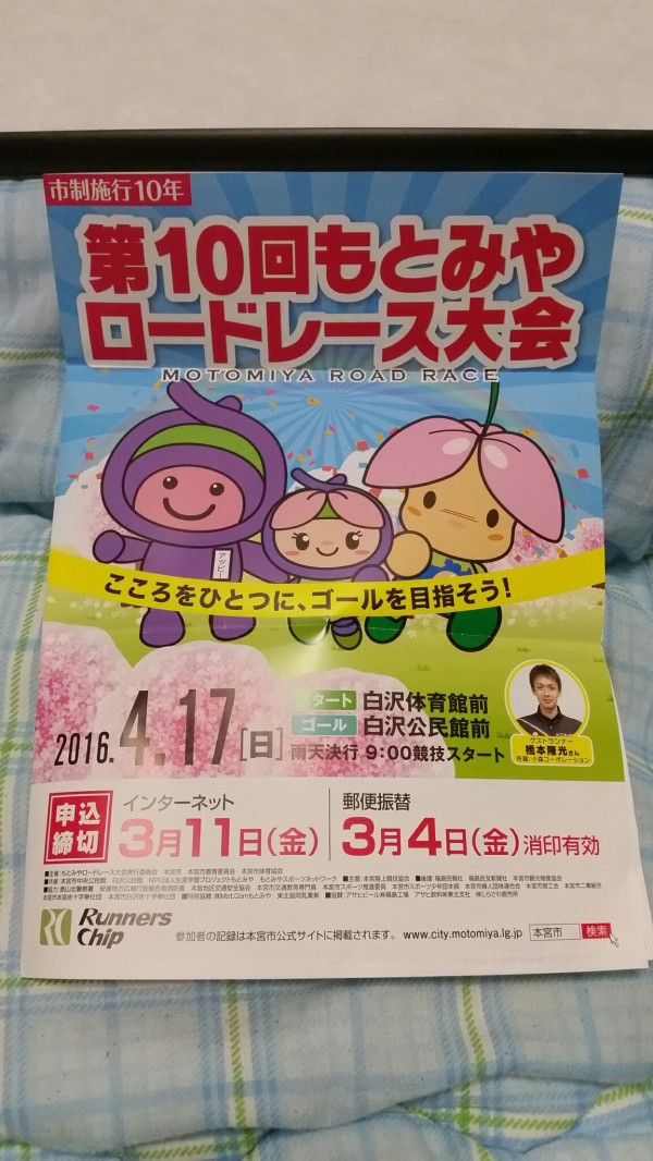 第10回もとみやロードレース大会案内 こんばんは山形市は小雨です。夜10時過ぎ車に乗ったらフロントガラスについた雨粒が凍りついて前がはっきり見えません、解氷スプレーで溶かしてから運転してきました。帰宅するとポストに昨年参加したもとみやロードレースの案内がありました。 参加料2500円はお得。Tシャツかキャップかバッグが参加賞で選べるし。5kmでエントリー予定。4月は笹川流れハーフマラソン、温海さくらマラソン、この大会と迷うけど1つに絞りがんばりたい。腹筋100回励みました。 via 間に合う碧 Your own website, Ameba Ownd