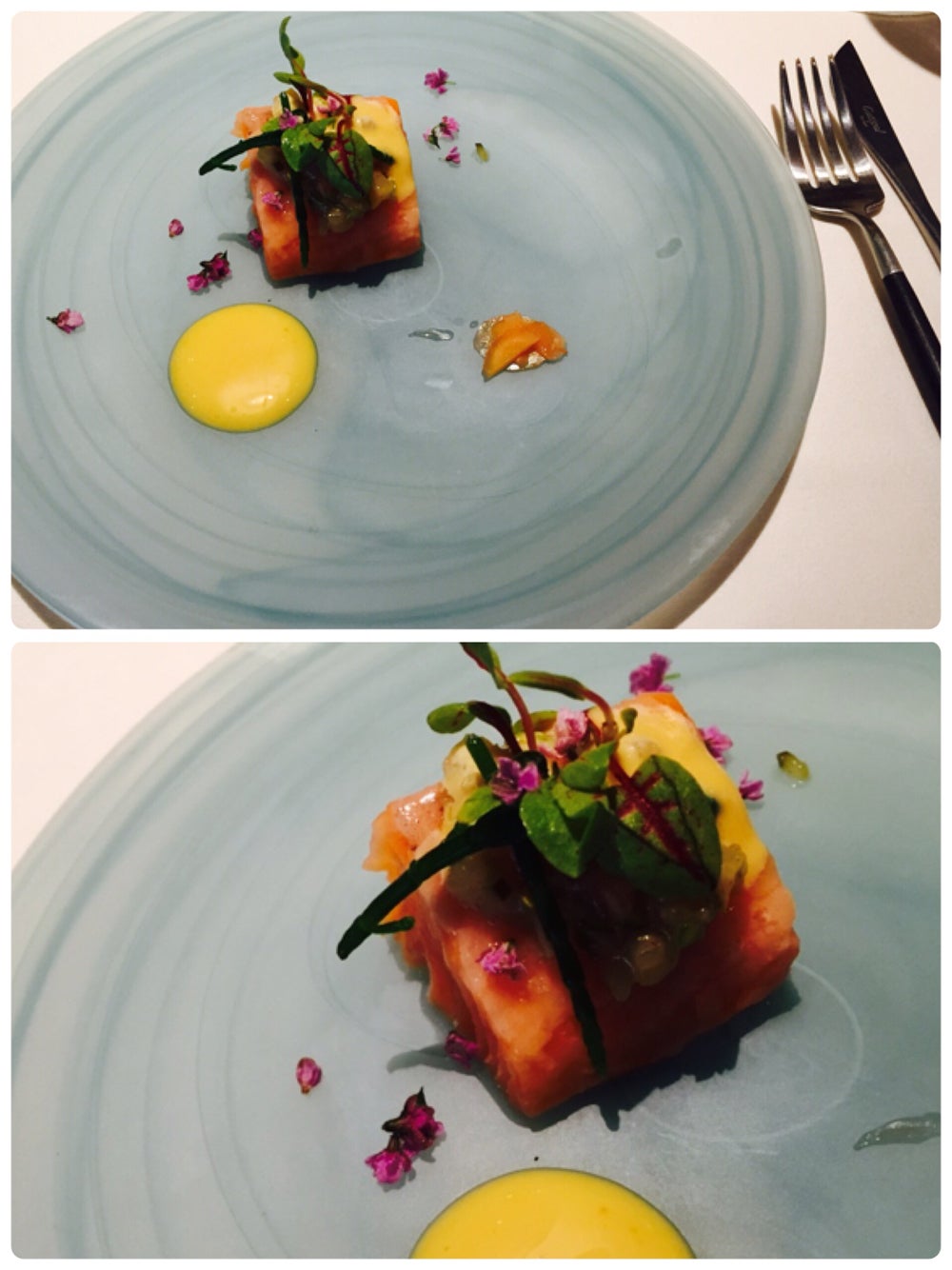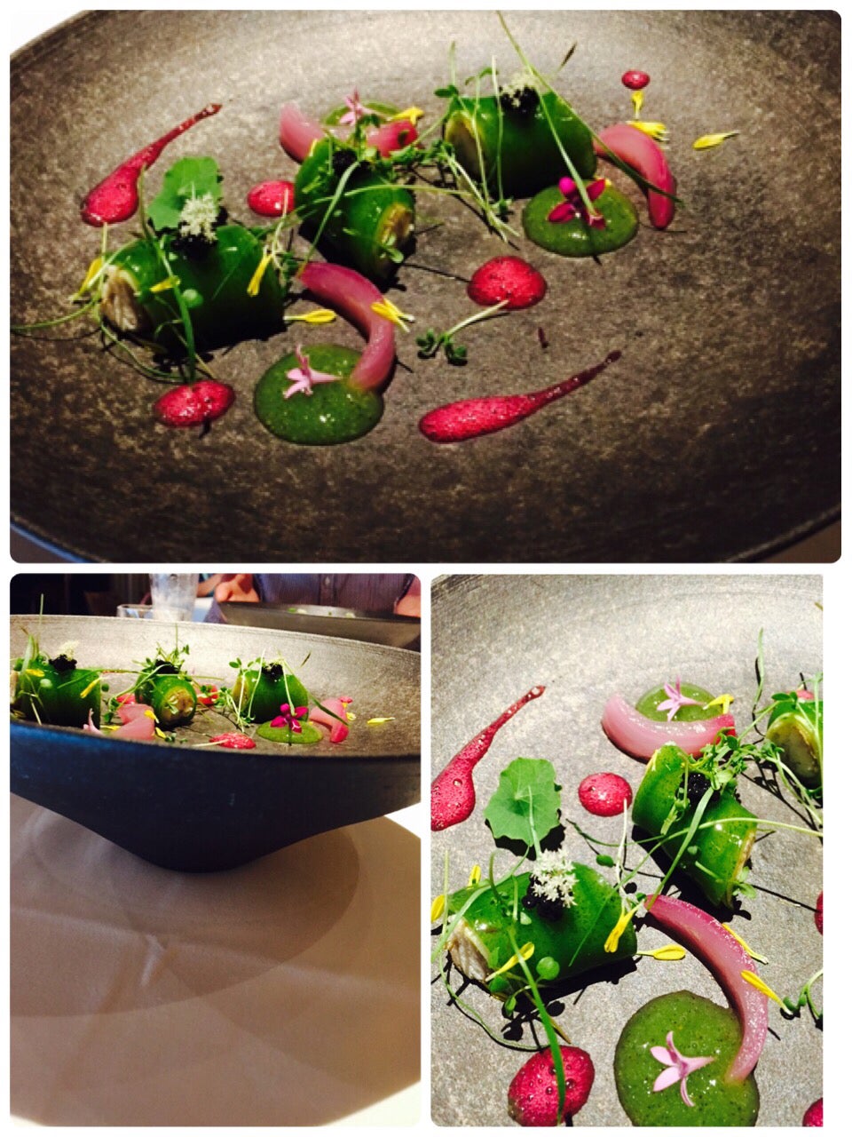 鮎をキュウリとキュウリのゼリーで巻いたもの。