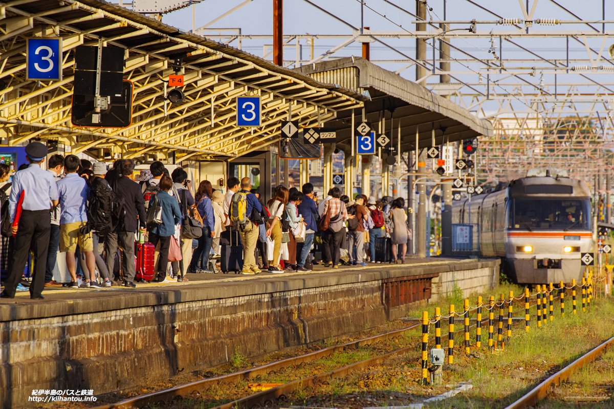 UターンラッシュとなったGW終盤の夕方の新宮駅3番ホームには、大勢の乗客が。