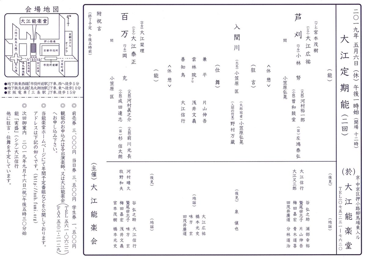 能「芦刈」大江広祐 能「百万」大江泰正 狂言「入間川」小笠原匡 仕舞3番。