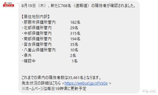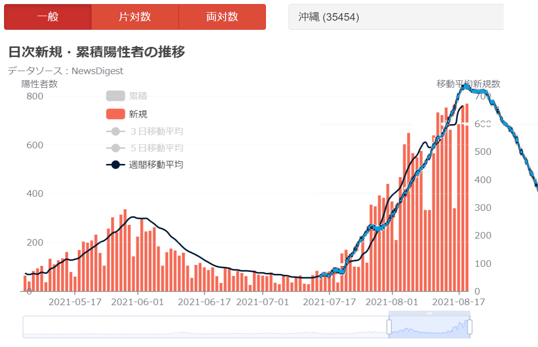 8/19の沖縄のCOVID-19の新規陽性者は768名と上昇期の平日なので記録更新が続く。ただ増加率は緩やかになっている。第4波は富士山の様に反り上がってpeakを越えたが、第5波は徐々に緩やかにpeak越え迎えそう。これは4波は濃厚接触者が広く追えたが、5波は感染者増大にPCR検査が追付いていないからだろう pic.twitter.com/h4G7G4ahfL