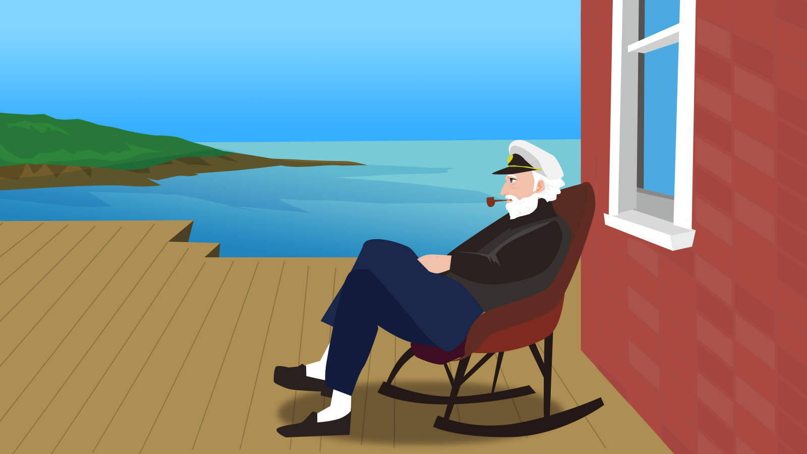 コテージのポーチでロッキングチェアに揺られている年老いた船長