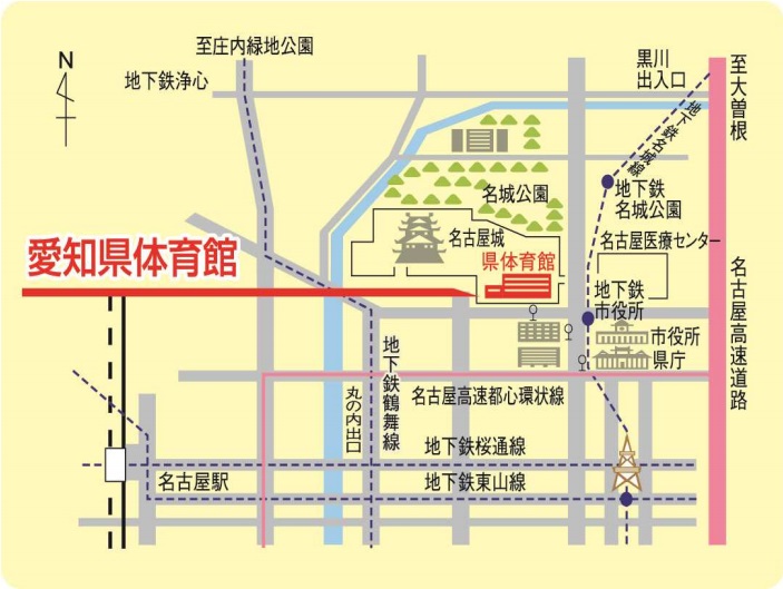 愛知県体育館には、駐車場はございません。お車でお越しの方は名古屋城二の丸駐車場もしくは、名古屋城正門駐車場にお停めください。