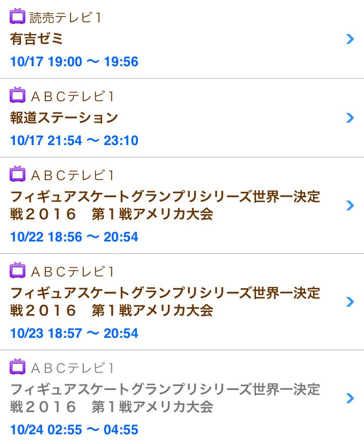 関西 ABC朝日放送でも放送あるみたい♪ フィギュアスケートグランプリシリーズ世界一決定戦2016 第1戦アメリカ大会 男子シングルフリースケーティング 2016/10/24 02:55 ~ 2016/10/24 04:55 http://talent.weeker.jp/epg/search?word=%83t%83B%83M%83%85%83A&area=27&date=10-16&hour=15&genre=0&type=0&searchBtn=%8C%9F%8D%F5 …