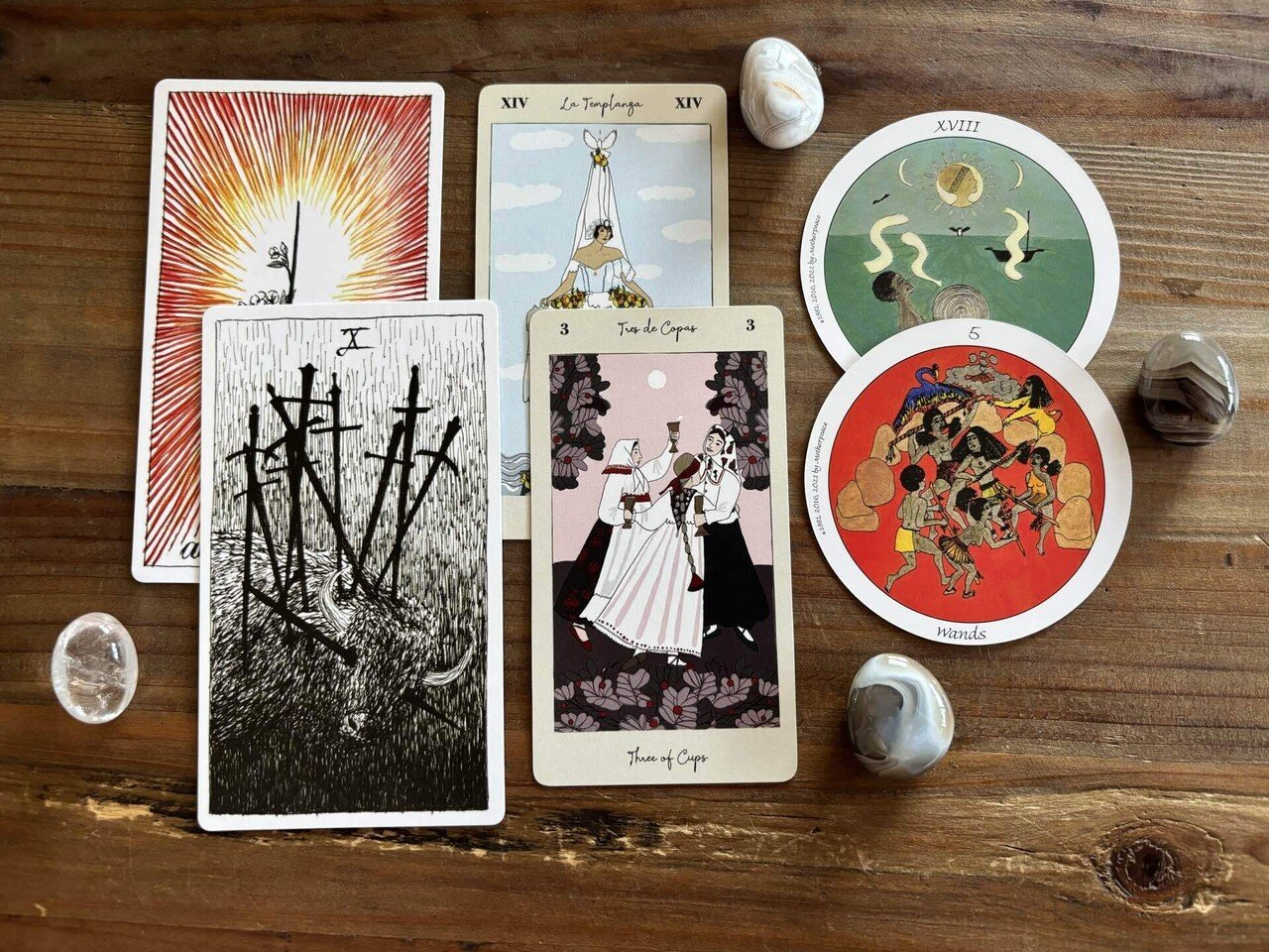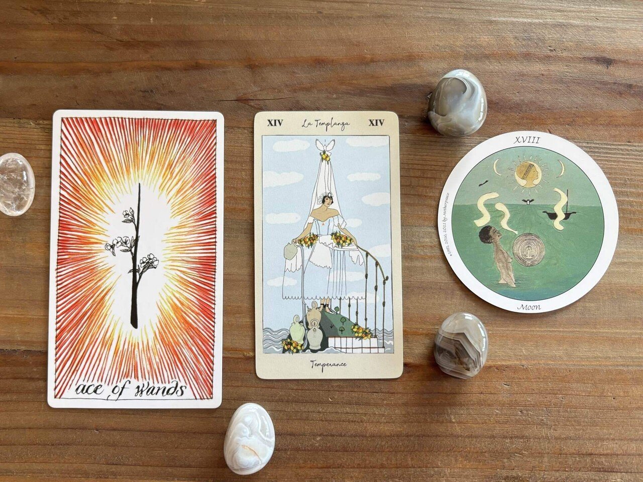 不安と期待の入り混じった様子が見えます。ワンドは情熱や能動性を表し、やる気や向上心のスートで、エースはそのエネルギーがいちばん強いカードです。ムーンは、何が正解なのかの判断基準がないまま、それでも足を(手を)止めるわけにはいかず、手探りだけで進んでいるようなカード。そしてテンペランスは、全くちがう物質を混ぜ合わせて、新しい何かを作ろうとしています。AとBを混ぜてはいるけれど、まだ何が出来上がるのかは分からない、というカードです。つまり、途中経過なんですね。近づいているのか、遠ざかっているのか分からないという、Cさんの心情がよく分かります。もう少し深堀してみます。