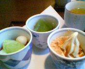 お茶会社の前半チームが明日から新橋外へプロ友のK先輩は前半チーム再来週まで逢えなくなるのが寂しくてお茶に誘った(*^_^*)汐留シティセンター B1F甘味茶房武蔵野茶房全席喫煙OK写真の甘味は20個?15個?の中から好きな甘味を3つ選べるセットでした。左から抹茶白玉・抹茶ゼリー・黒密きな粉ソフトです。うま~