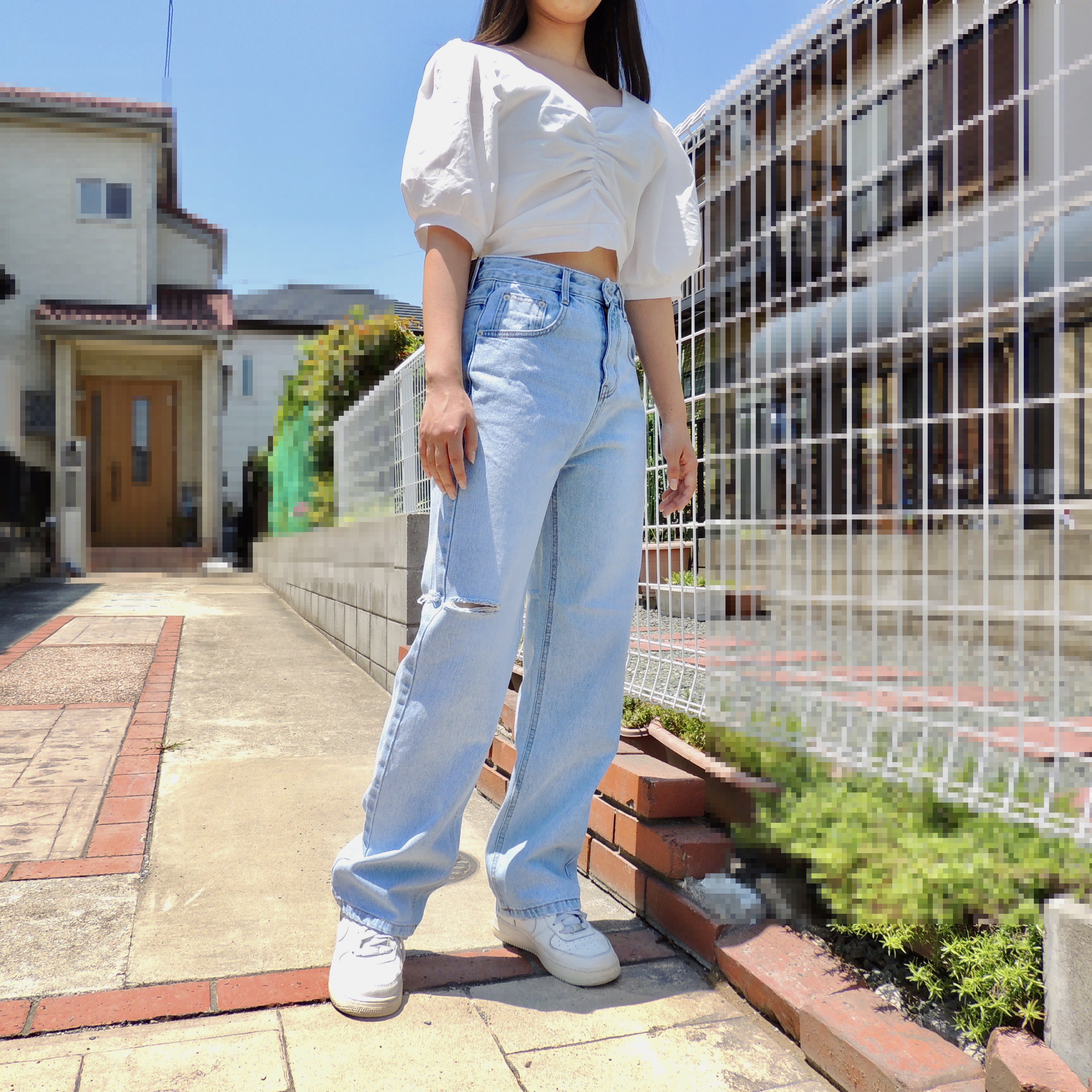 そしてこんなフェミニンなトップスを、ちょっぴりワイルドにダメージの入ったデニムで