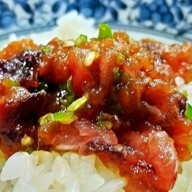 左の茶色い漬けのお刺身をご飯の上にのせ、出汁をかけて食べます。