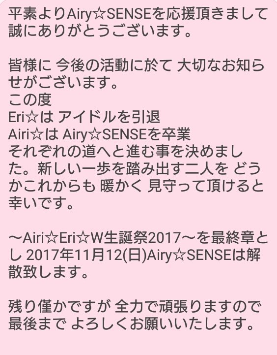 【Airi☆】みなさん急な発表で驚かしてしまってすみません。