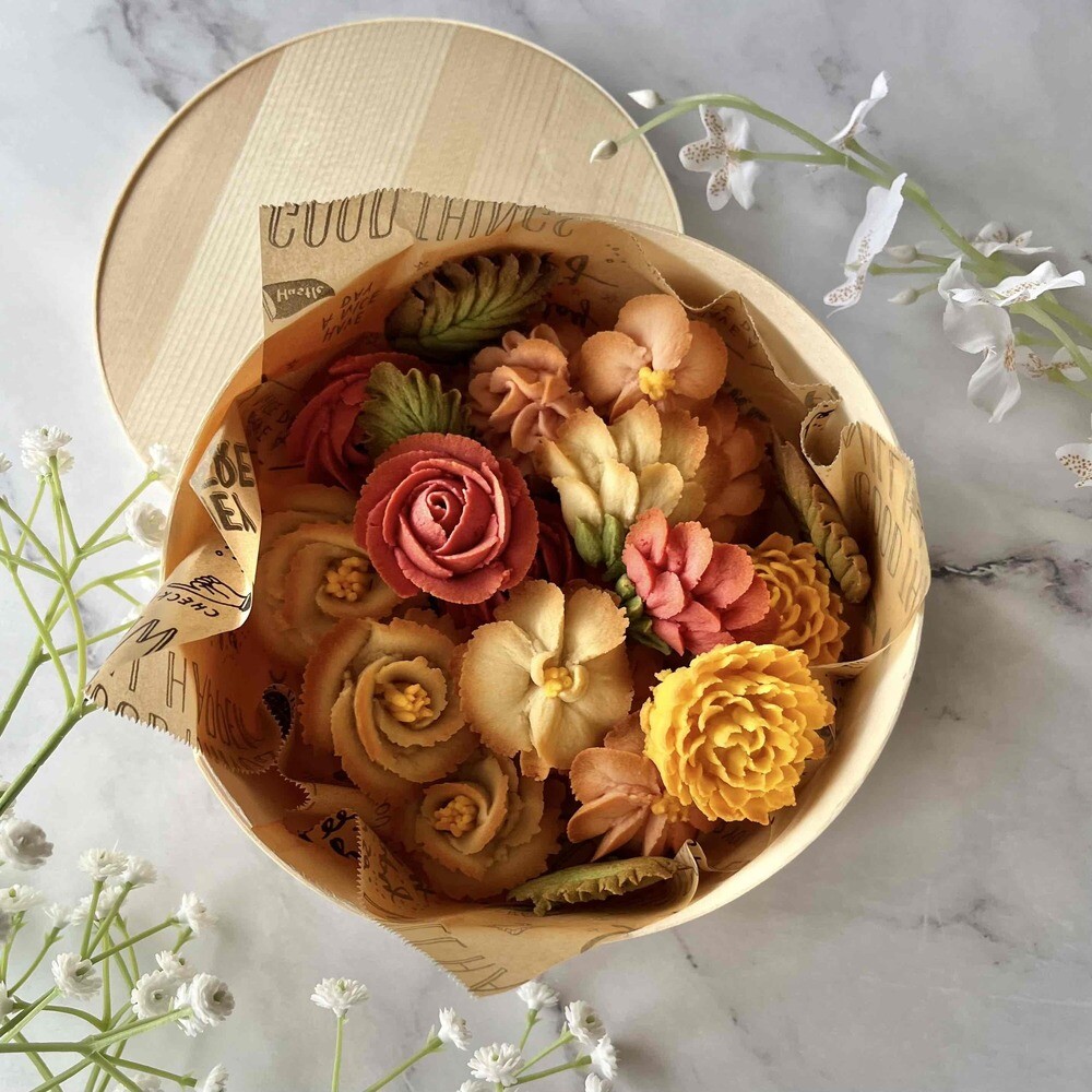 グルテンフリーのカップケーキにお花を3種類、全部で9個のカップケーキに絞っていただきます。