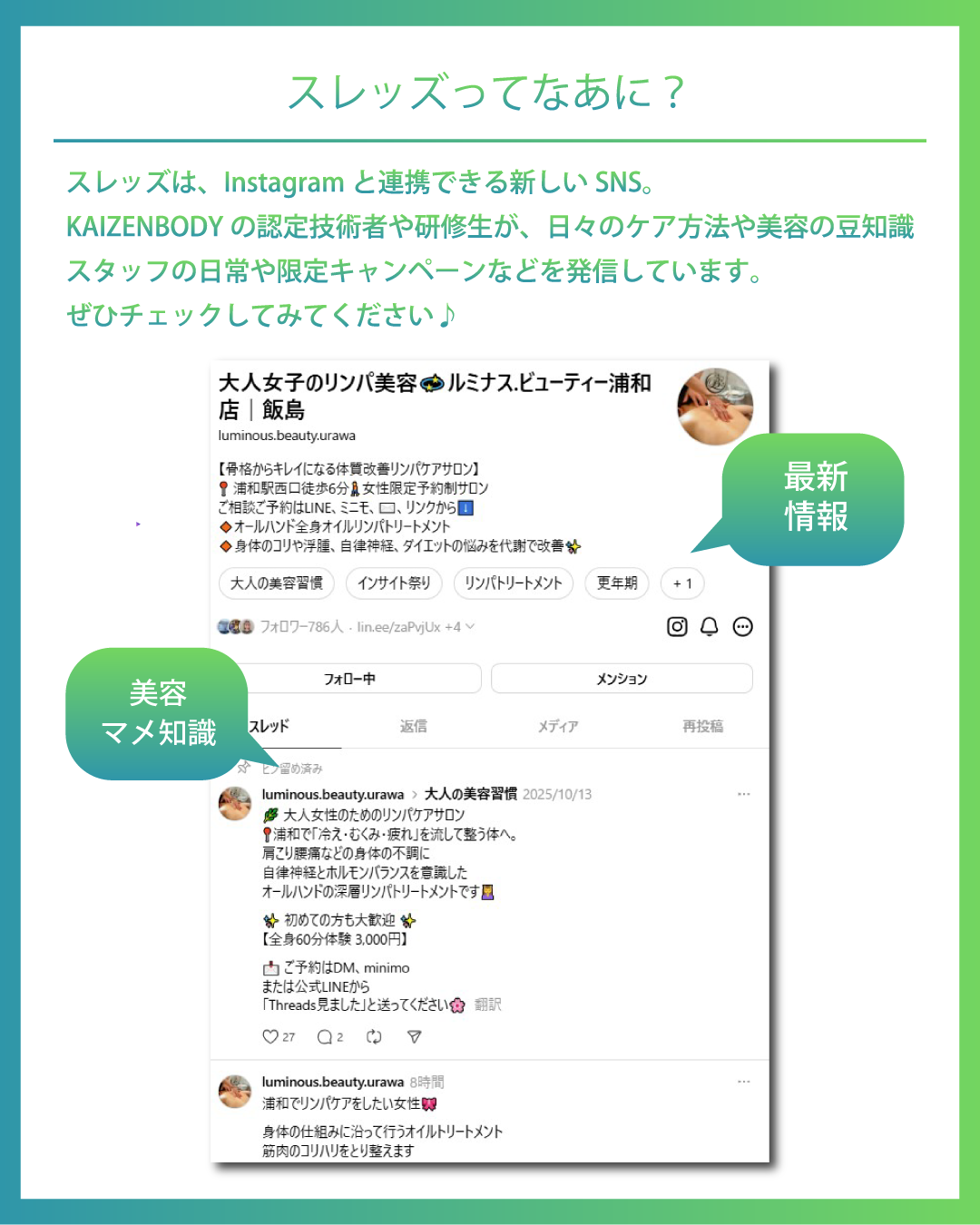 美容のヒントやお得情報をいち早く知りたい方は、ぜひスレッズをフォローしてチェックしてみてください。