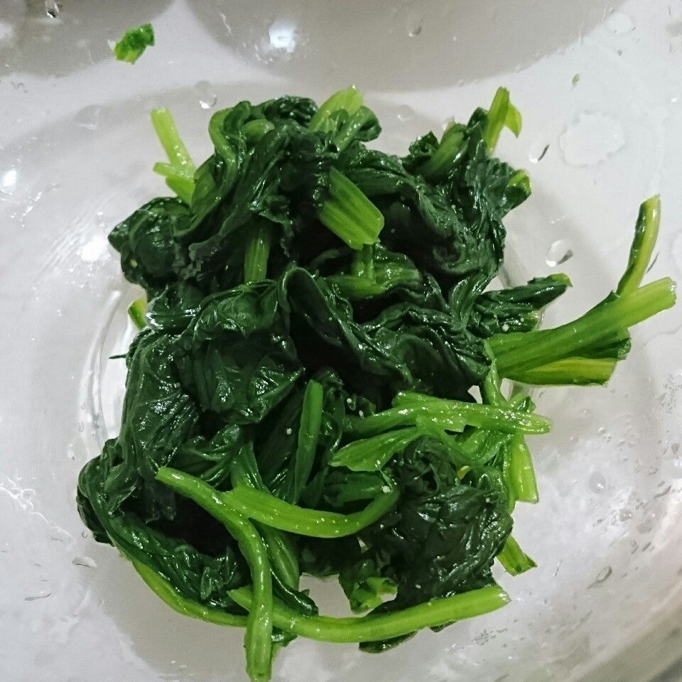 茹でたほうれん草に鶏ガラスープの素をかけてよく混ぜる