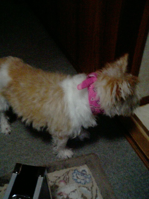 モモ。首にバンダナ。を、付けられた。毛は、家の母親と格闘の末、こんなんになってしまった・・・モモは風呂(体を洗う)のを嫌うもんで。母親と、どんな格闘があったのかは、想像がつく。笑ける!