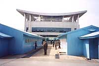 手前が韓国、奥が北朝鮮。お互いの軍人が目をあわさないように立っていて、韓国兵は雨の日でもサングラスをしており、北朝鮮兵の挑発に乗らないようにしているという・・・・。ここの境目は緊張感たっぷり。