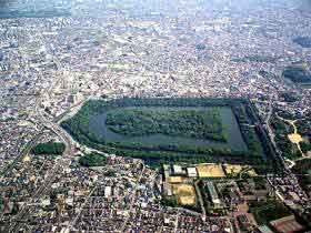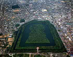 しかたないので航空写真を載せておきます。こうやって見ると仁徳古墳は大きくて綺麗だ。古墳時代にこれだけ綺麗に測量したのもすごい。古墳の周りにはお堀があるが、仁徳古墳だけは3重。古墳は土で作るから、地面が掘られたのがそのままお堀になったようです。