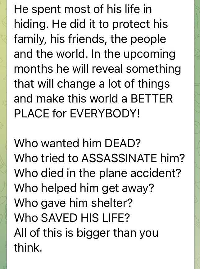 彼は人生の多くを隠れて過ごしました。それは彼の家族や友人たち、世界中の人々を守りたいと思ったからです。これからやって来る数ヶ月間に彼が暴露することで、世界中のたくさんの事が変わり、人類にとってより良い場所になるでしょう。