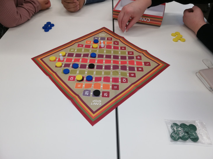 「CAN’T STOP」。4つのダイスの出目の確率を考え、取るべきレーンを選び、レーンを3つ制覇した人が勝ちます。ダイスの出目の確率を考えて、押すときと引き時を考えながらサイコロを振らねば勝てません。実はなかなか考慮要素が多い高度なゲームなのです。