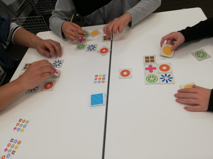 「ナインタイル」。裏表に図形が描かれた9つのタイルを、お題カード通りに揃えます。このタイルはいいけど、このタイルはうまくいかない‥なんてこともおこります。あれこれ素早くめくって、お題を達成できるよう並べましょう。