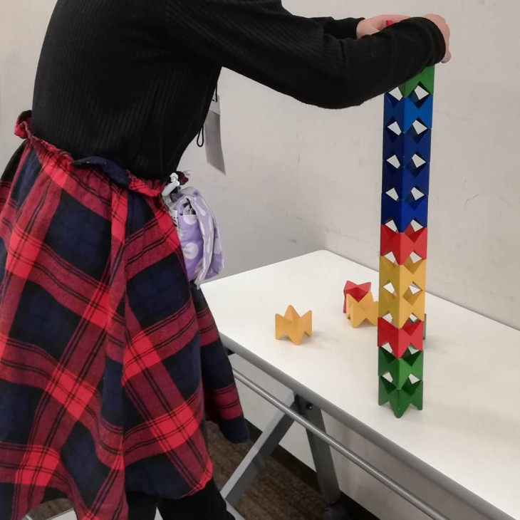 当会では常にある積木。馴染み深い玩具になっていますが、初参加の方には珍しく映るもののうちの一つであり、その色彩や面白い形からとりこになる人も多数です。
