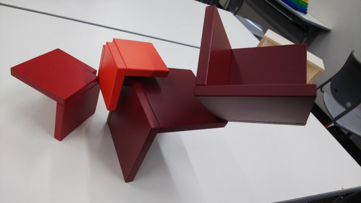 小学生の作品です。アングーラのL字型を椅子に見立てて、その中に、ステンダーを使った小さな人を作り座らせていますよ。