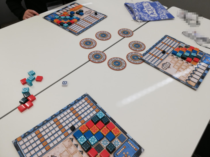 「AZUL(アズール)」。ボードにタイルを載せられるようになるには、動く場のタイルを常に把握し、自身のほしいタイルを適切なタイミングでとっていく必要があります。相手目線での作戦を想定することも必要になる高度なゲームです。