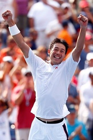 セットカウント2-1で迎えた第4セットの第1ゲーム、錦織はジョコビッチのサービスの乱れを狙い、強烈なリターンを放って0-30に持ち込んだ。勝負所をしっかり抑えながら、巧みな力の出し入れ……。15-30からジョコビッチが献上した重いダブルフォルトは、強い風のせいではない。そこまで蓄積してきたショットの軽重、ラリーに込められた攻撃性の濃淡の果てであり、15-40からジョコビッチのフォアハンドが力足らずにネットにかかった。このサービスブレークは、初めての6試合目、4時間超の2試合を戦ったボロボロの肉体には爽やかなシャワーだ。