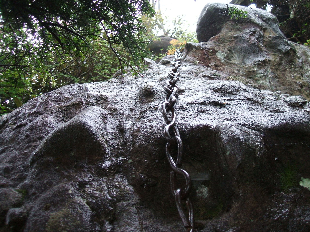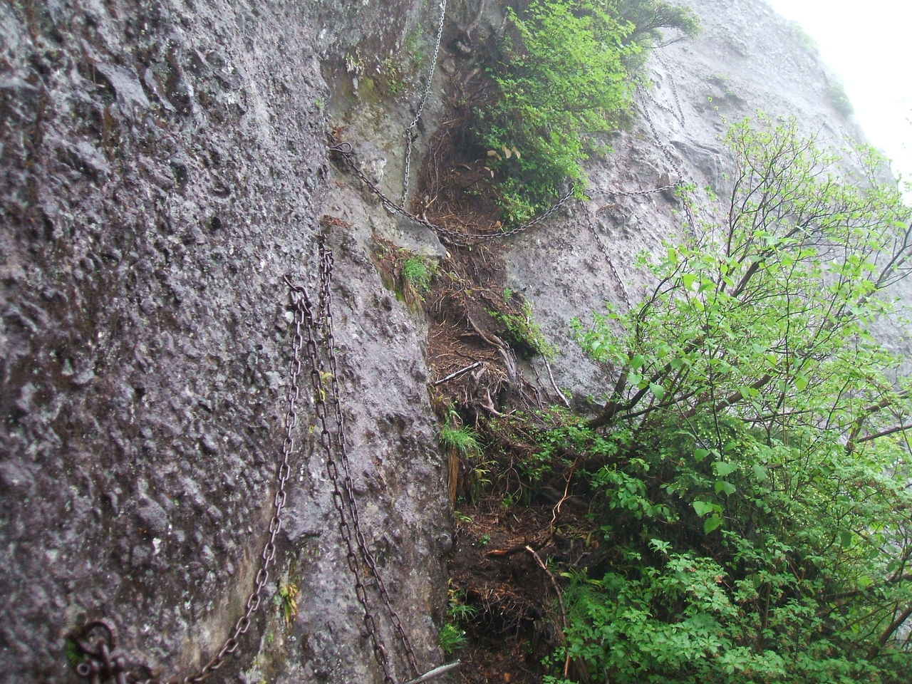せ、狭い・・・ 岩が雨に濡れてスリッピー。 慎重にステップとホールドを確保しながら進みます。