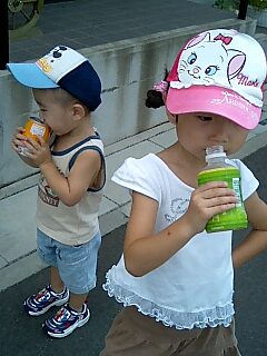 (1193)喉渇いたね?昨日の散歩中の1コマ。かなり暑かったので、自動販売機で買ってあげました。このあとソータロー王子は1人で全部飲んじゃいました!最近はオレンジジュースがお気に入りらしい。この後公園行ったんですが、あまりの暑さにへばったネネ姫が「パパ~、おうち帰りたい。」と珍しく帰宅をアピールしたので、すぐに帰りました。台風のおかげで暑かったり涼しかったりと、気候の変化が激しいので体が参ってるんでしょうね?そういえば鼻水すすってたなあ?