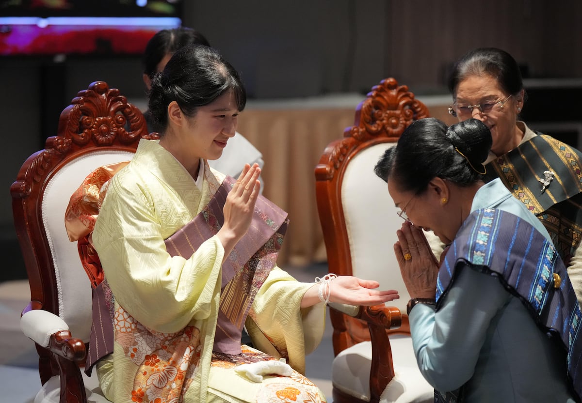 18日夜、愛子さまは振り袖に、同国の民族衣装である肩掛け「パービアン」を身に着けてご参加。両国関係者とともにマリーゴールドやラオスの国花であるプルメリアなどで飾られた祭壇を囲まれた。祈祷師が愛子さまの健康などを祈る間、愛子さまは関係者とともに祭壇から伸びるひもを持ち、合掌されていた。