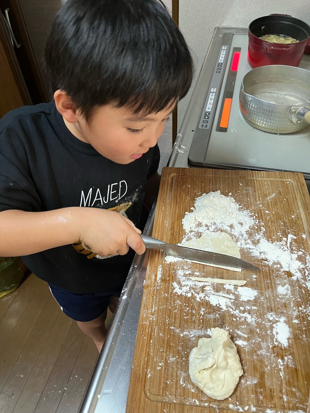 チビ達に小麦粉をコネコネさせて