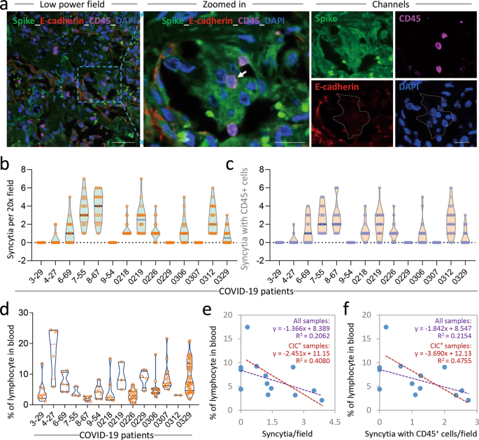我々はここで、コロナウイルス2019年疾患(COVID-19)患者の肺組織では、多核の合胞体の中にリンパ球が入ったヘテロタイプの細胞内構造が広く見られることを示した。