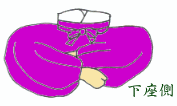 - 装束を着用しての坐法の基本となるものです。あぐらをかくように座りますが、足を組まずに足の裏と裏を密着させるように座ります。膝が左右に張って非常に威儀を感じさせるものです。古い貴人の肖像画などをご覧になれば、まずこの坐法によっているものとわかるでしょう。慣れないと内股の筋肉が痛くなりますが、慣れてしまえば苦になりません。