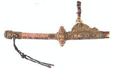 (2)細太刀:飾太刀があまりに高価なために代用した細身の太刀で唐鍔。これでも豪華なもの。
