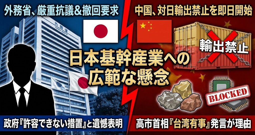 > 中国が日本に対し軍事転用の可能性がある品目について輸出を禁止する新たな制裁を発表。