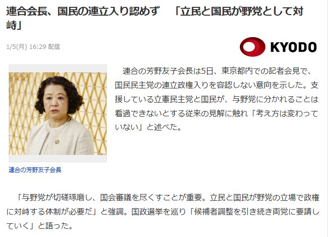 >"連合会長、国民の連立入り認めず 「立民と国民が野党として対峙」"