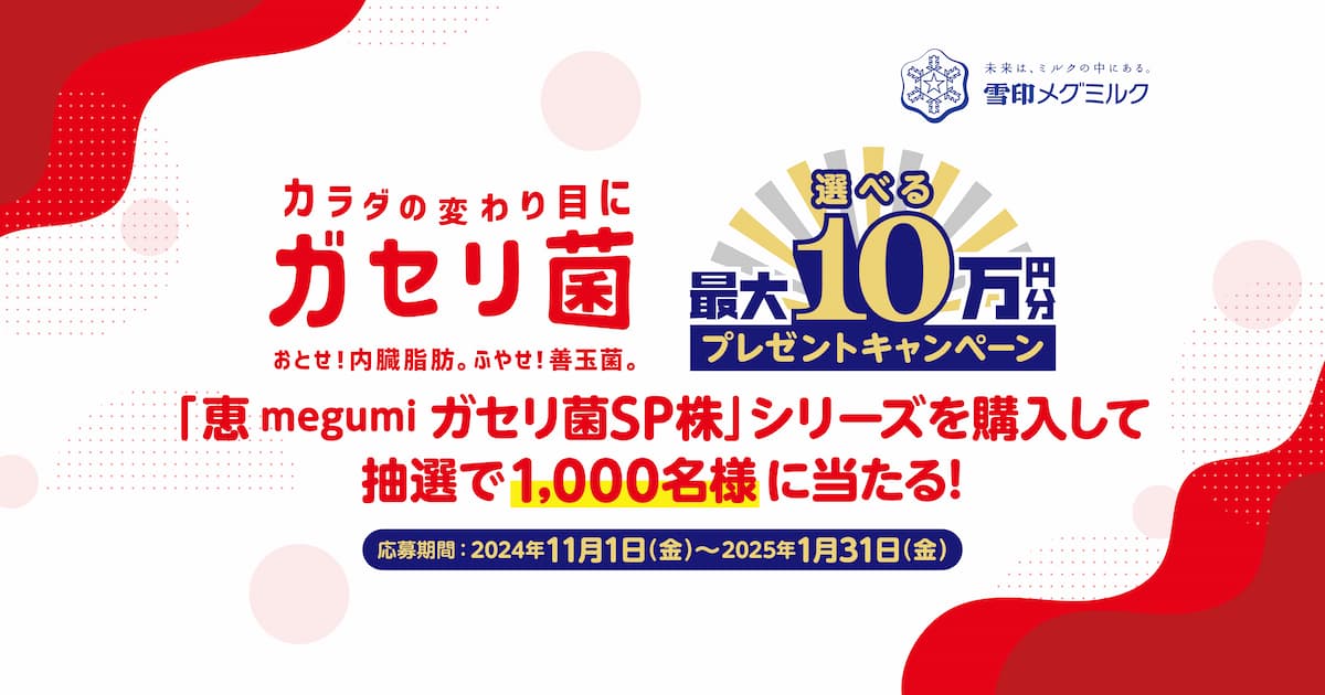 選べる最大10万円分プレゼントキャンペーン|恵 megumi ガセリ菌SP株ヨーグルト|雪印メグミルク株式会社選べる最大10万円分プレゼントキャンペーン 「恵 megumi ガセリ菌SP株」シリーズを購入して抽選で1,000名様に当たる!www.megumi-yg.com