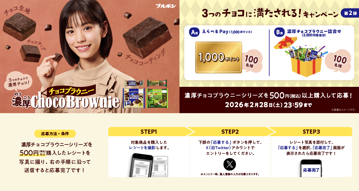 対象商品を買ってきました/ブルボン対象商品を買ってきました / #濃厚チョコブラウニー「3つのチョコに満たされる!キャンペーン第2弾」実施中! \#ブルボン #濃厚チョコブラウニーbourbon.ownly.jp 前回は不参加だったキャンペーン 今回は商品を見かけて、なおかつこの3点でほぼ500円分だったので購入することにしました 私にはちょっと甘すぎるのですが、家族が食べるので応募します ブルボン 濃厚チョコブラウニー 9袋 楽天市場 ブルボン 106g ミニ濃厚チョコブラウニー (12×2)24袋 (チョコレート お菓子 景品) (ケース販売) (Y10) (本州送料無料) 楽天市場 【ふるさと納税】世にもおいしい チョコブラウニー 8個 × 2箱 個包装 濃厚 本格 オリジナルスイートチョコレート ブラウニー 新食感 お菓子 焼き菓子 スイーツ デザート チョコレート チョコ ケーキ チョコチップ お取り寄せ オールハーツカンパニー 滋賀県 守山市 送料無料 楽天市場 【お徳用】高級 チョコブラウニー 1kg 訳あり 個包装 大容量 チョコ ブラウニー 焼き菓子 洋菓子 おやつ スイーツ ばらまき 差し入れ 友人 職場 プチギフト イベント 子供会 体育祭 バレンタイン クーベルチュール ナッツ お菓子 北海道産【D】 楽天市場 濃厚チョコブラウニー2種セット 楽天市場 【バレンタイン】 無添加 グルテンフリー 米粉 焼菓子 スイーツ ガトーショコラ 【箱崎ブラウニー 白味噌風味バターケーキ ミソマッチィ 送料無料 (一部地域追加400円)】小麦粉不使用 白砂糖不使用 訳あり 訳有 ご自宅用 お配り用 楽天市場 バレンタイン お菓子 蒜山ほしのブラウニー6個入 岡山 お菓子 お取り寄せ ギフト 特産品 岡山県 グルメ 岡山土産 くらしき プレゼント お菓子詰め合せ 岡山特産品 チョコブラウニー アーモンド トッピング 蒜山土産 洋菓子 帰省 手土産 個包装 卒業祝い 退職祝い ハロウィン 楽天市場 訳あり .濃厚ショコラブラウニー黄金フロランタン10個. 贈り物 スイーツ わけあり セット 洋菓子詰合せ ブラウニー フロランタン 訳アリスイーツ 洋菓子 個包装 お取り寄せスイーツ ポイント消化 【DS09】 【★】 楽天市場 お米で出来たチョコブラウニー 6個入り 有限会社 東京堂 生産者直送【グルテンフリー ローカロリー 低カロリー こめゲル 米Gel お米スイーツ デザート 小麦粉不使用 卵不使用 バター不使用 ヘルシー 洋菓子】【お土産/手土産/ギフトに!贈り物】【送料無料】 お歳暮 楽天市場