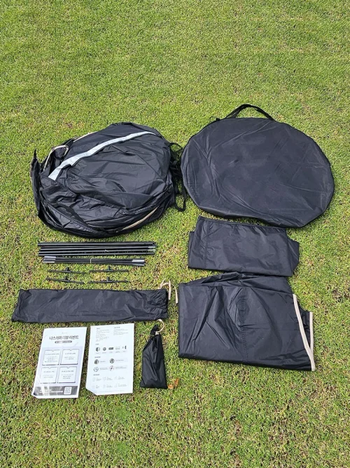 この連結テントの最大の魅力は、その汎用性の高さだと感じました。日中はリビングとして、夜は就寝スペースとして活躍。また、前室のような使い方もできるため、荷物置き場やプライベート空間としても活用できます。生地もしっかりとした作りで、多少の風雨でも安心して使用できそうです。さらに、撤収も設営と同じくらいスムーズで、後片付けの負担が軽減されたのも嬉しいポイントです。