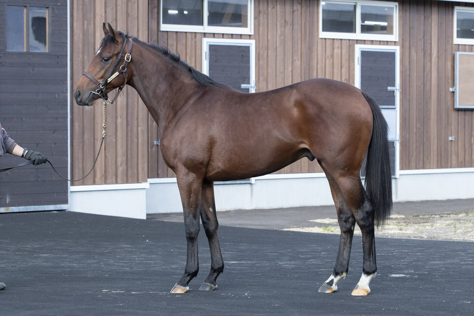 担当者「その後も順調に進めることが出来ており、この中間は本格的な調教を開始しています。現在は週3回坂路コースでハロン18~19秒のキャンターを1~2本のメニューを行っていますが、週によっては周回コースでの調教も取り入れていて、馬の状態に合わせてメニューを調整しながらここまで進めています。小柄ながらも筋肉のボリュームと体幹の強さがあって、乗り込んでいくにつれて幼さが徐々に抜けてきました。気性面については基本的に大人しい性格ですが、テンションが上がると我慢の利かないところがあります。とは言え、旺盛な前進気勢は実際のレースにおいても重要な要素にもなるため、悪い方に向かないように、注意しながら進めていきたいと思います。当初は走りを見てもダート適性の印象でしたが、硬さも薄れてきて洋芝も合いそうな動きをしていますね。これからさらに良化するポテンシャルを秘めている馬だと思いますので、引き続き心身共に成長を促しながら進めていきたいと思います」馬体重438kg