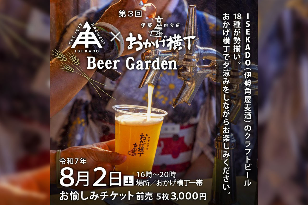【奉祝 風日祈祭】伊勢で祝う夏のクラフトビアガーデン「ISEKADO × おかげ横丁」8/2開催 ISEKADOが誇る16種のクラフトビールに加え、KADOLABOやDIGNITYなど限定ボトルが2種、計18種が提供されるそうです! 入場は無料ですが飲食はチケット制 お得な前売りチケットもあるそうです (前売 3,000円/当日 3,500円(ビール1杯or料理700円相当 ×5枚綴り) 【奉祝 風日祈祭】伊勢で祝う夏のクラフトビアガーデン「ISEKADO × おかげ横丁」8/2開催決定 | BEERTIFUL MAP2025年8月2日(土)、三重・伊勢市おかげ横丁で「第3回 ISEKADO × おかげ横丁 Beer Garden」が開催されます。伊勢神宮の「風日祈祭」に合わせ、地元クラフトビール16種+限定ボトル2種、旬の食材を使った夕涼みメニュー、和太鼓演奏・ライブ・醸造トークなど多彩な催しが楽しめるイベントです。入場無料、チケット制で乾杯と食事も充実。www.beertiful.jp
